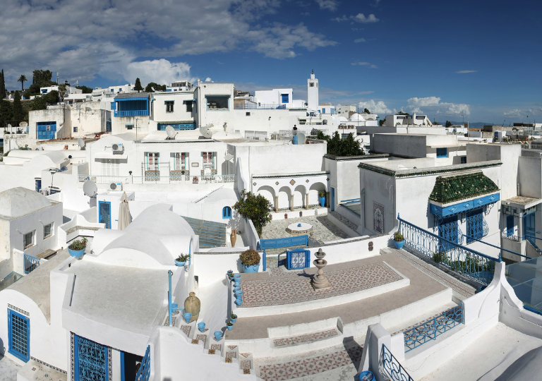 Sidi Bou Said ricorda un villaggio di artisti, è un luogo di rara bellezza dove dominano i colori. Le case sono di un bianco variopinto e sulle facciate spiccano persiane e porte decorate blu. Un luogo incantevole la cui bellezza è enfatizzata da rigogliose bouganville che donano un energico tocco magenta.